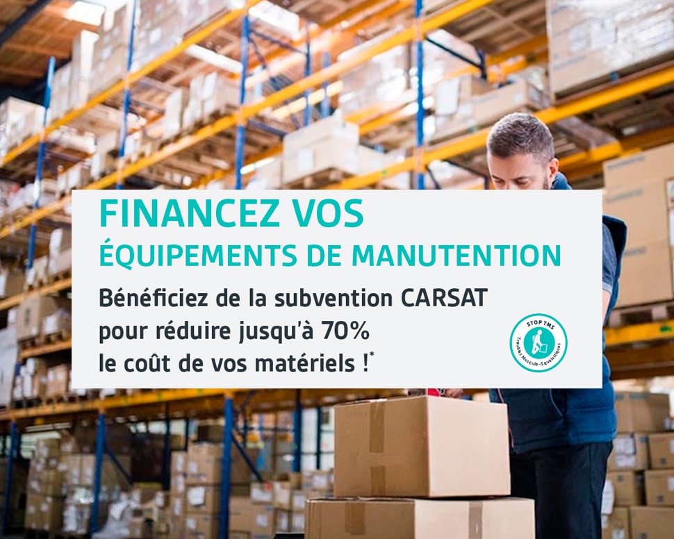 Chez Chariotech, nous savons qu’équiper votre entreprise en matériels de manutention représente un investissement conséquent. Bonne nouvelle : grâce aux aides financières proposées par la CARSAT (Caisse d’Assurance Retraite et de la santé au Travail), vous pouvez bénéficier d’une subvention allant jusqu’à 70% du montant de vos équipements !